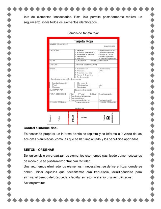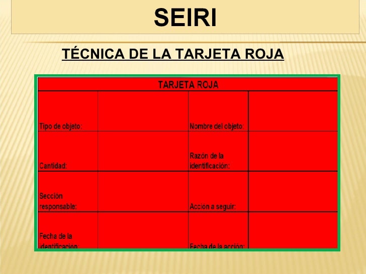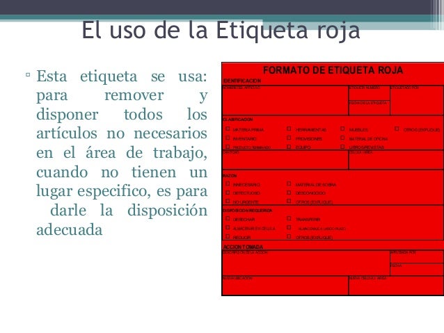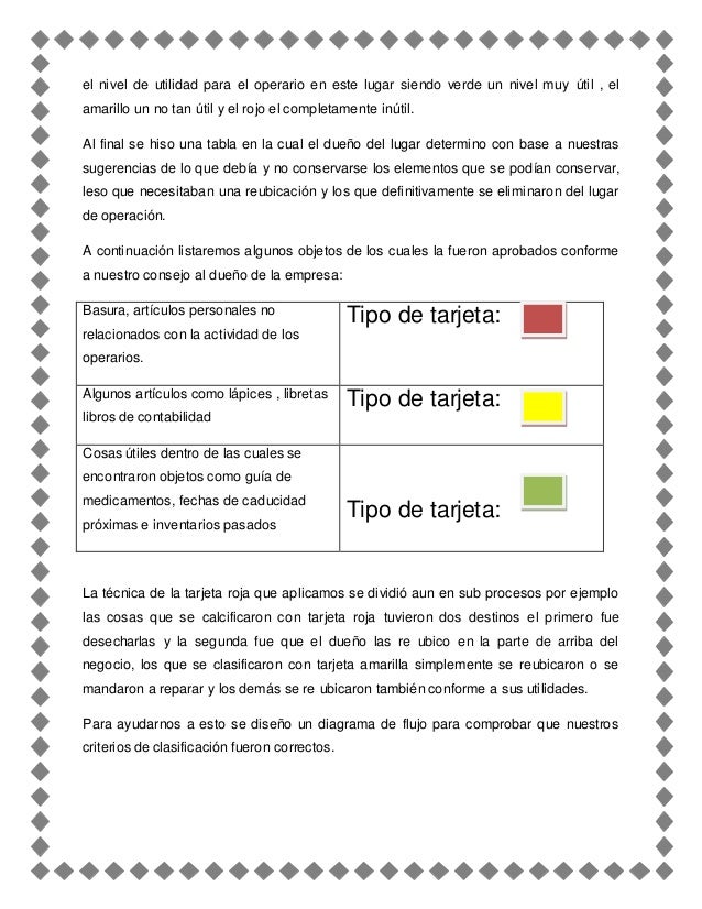 5S from image.slidesharecdn.com Figura 4.3 área de tarjetas rojas y material etiquetado… Facilitando un mayor aumento de la productividad. Se basa sobre la estrategia de la "tarjeta roja", que consiste en identificar los objetos que . "implementación de 5s como una metodología de mejora en una empresa de elaboración de pinturas". B) aplique tarjeta roja a equipos, artículos, herramientas o materiales sobre los que el uso sea dudoso. La tarjeta roja significa que es necesario aplicar las tres "3" primeras "s" ya que el área o estación de trabajo requiere de mejora. Tarjetas rojas a todos los elementos innecesarios con lo que hacemos . De mantenimiento de las mejoras alcanzadas con la aplicación de las 5s.