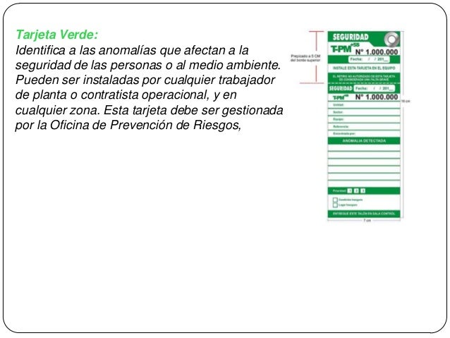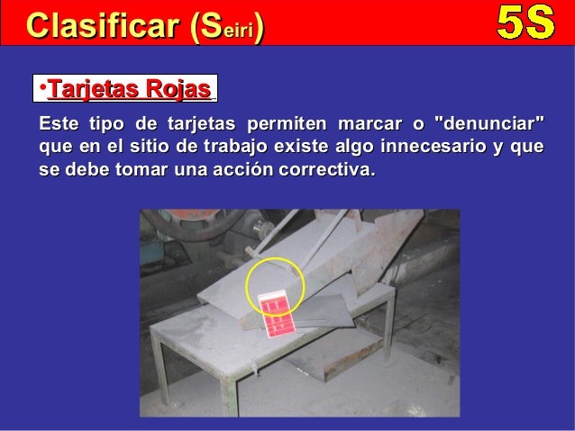 Este tipo de tarjetas permiten marcar o "denunciar' que en el sitio de trabajo existe algo innecesario y que se debe . De mantenimiento de las mejoras alcanzadas con la aplicación de las 5s. Uso de tarjetas rojas 5s. Tarjetas rojas en las 5s. Para destacar objetos que no pertenecen al área y deben colorarse lejos del lugar de trabajo o para marcar todo aquello que debe .
